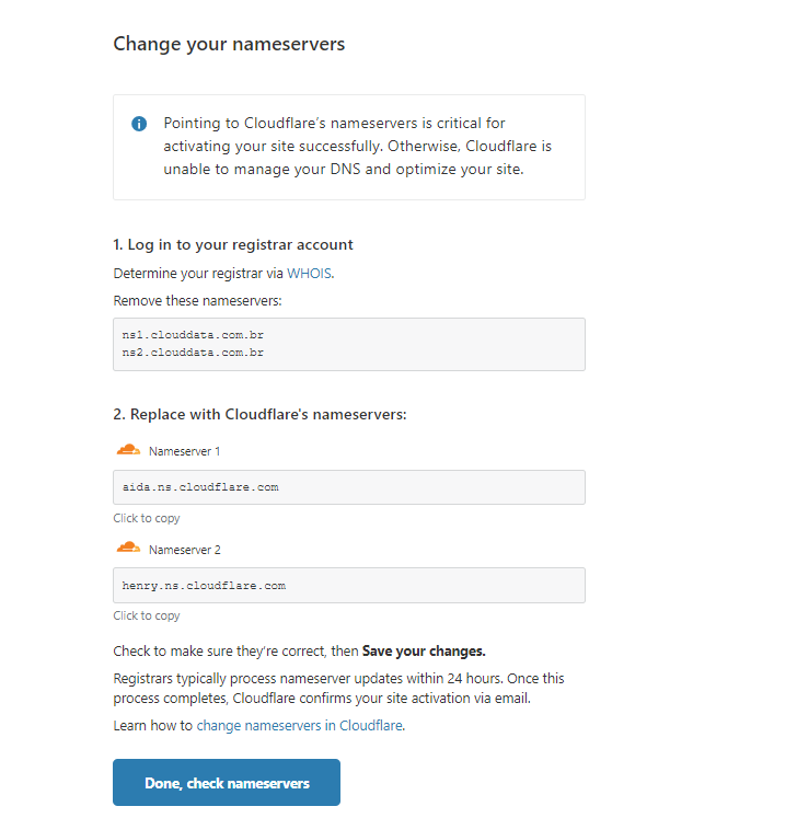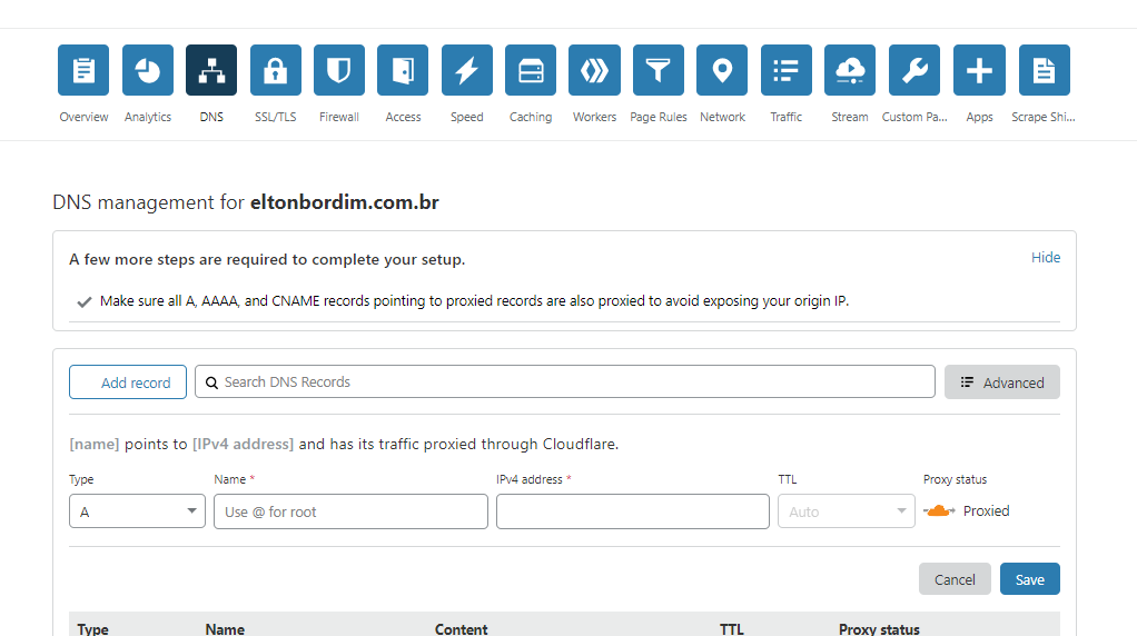 6 -Após esta etapa, o DNS do nosso Site (domínio) está sendo gerenciado pelo Cloudflare, onde habilitaremos alguns recursos.
