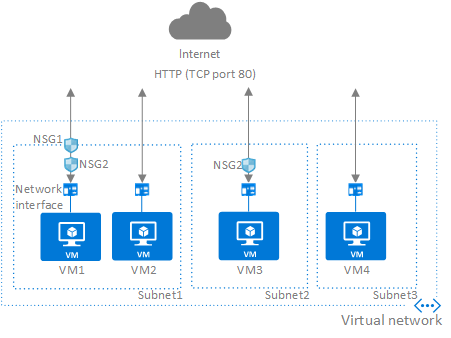 É importante observar que as regras de segurança em um NSG associado a uma sub-rede podem afetar a conectividade entre as VMs dentro dela. Por exemplo, se uma regra for adicionada a NSG1 que nega todo o tráfego de entrada e de saída, VM1 e VM2 não poderão se comunicar entre si. Outra regra teria que ser adicionada especificamente para permitir isso.