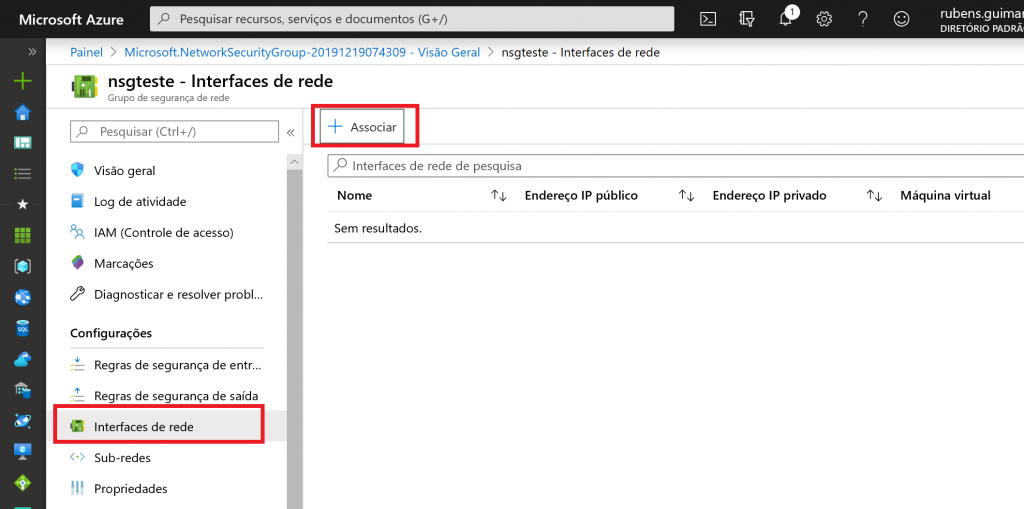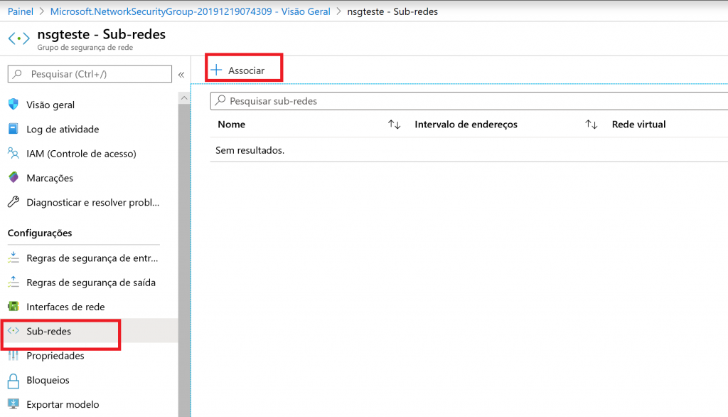 Para instalar o serviço, localize o NSG no Marketplace do Azure. Após a instalação, abra o serviço e associe o NSG a uma sub rede do Azure (por exemplo):