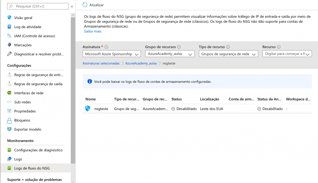 E para finalizar, você pode habilitar o log de transações para monitorar todo o tráfego de rede que passar pelo NSG, auditando posteriormente os filtros que foram aplicados: