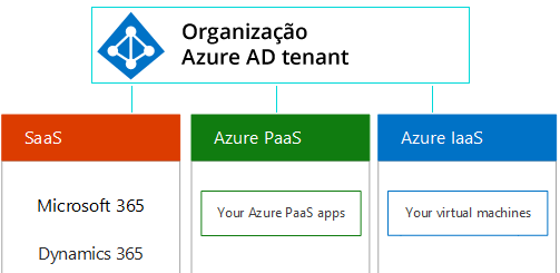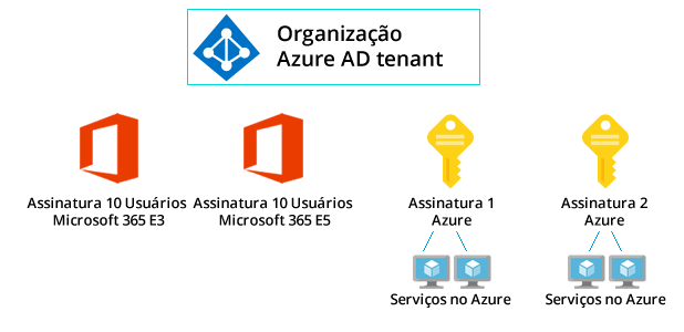 Assinaturas estão abaixo de uma organização e podem oferecer serviços SaaS como Microsoft 365 (pagamento por usuário) ou serviços no Azure, por exemplo em modalidade PaaS e IaaS (pagamento por consumo).