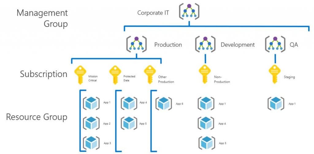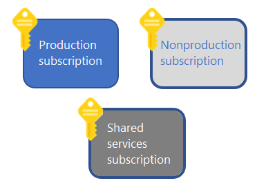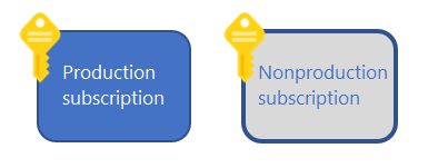 À medida que aumenta o volume de nuvem de uma organização, normalmente, assinaturas adicionais são criadas para dar suporte a aplicativos com diferenças fundamentais em importância comercial, requisitos de conformidade, controles de acesso ou necessidades de proteção de dados. Baseando-se nas assinaturas iniciais de produção e não produção, as assinaturas que dão suporte a essas categorias de aplicativos são organizadas no grupo de gerenciamento de produção ou não produção, conforme aplicável.