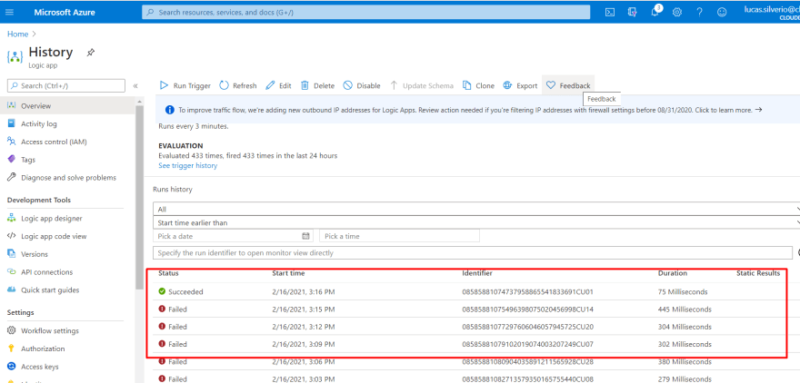 Na página do logic app no portal do azure, podemos ver o histórico das execuções do logic app.