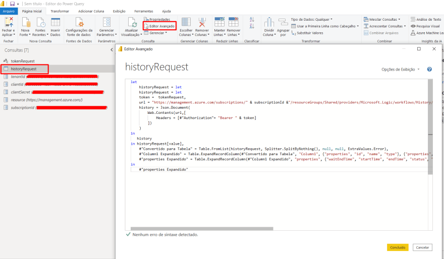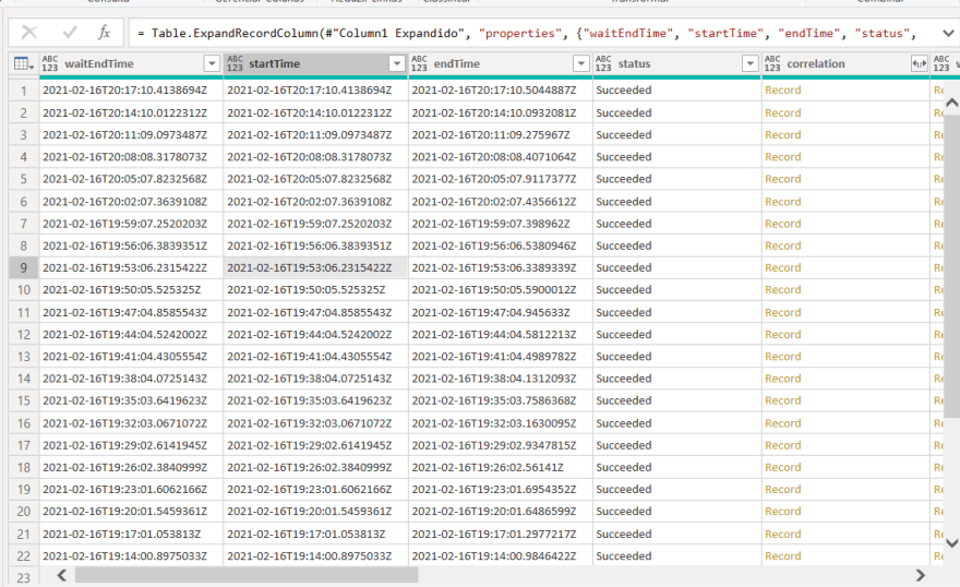 #"properties Expandido" = Table.ExpandRecordColumn(#"Column1 Expandido", "properties", {"waitEndTime", "startTime", "endTime", "status", "correlation", "workflow", "trigger", "outputs"}, {"waitEndTime", "startTime", "endTime", "status", "correlation", "workflow", "trigger", "outputs"})