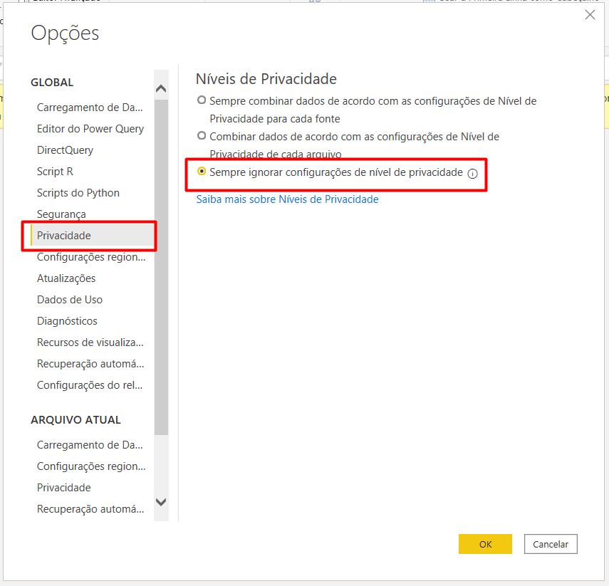 Como estamos executando consultas encadeadas armazenadas em parâmetros diferentes recebemos essa mensagem por questões de segurança do power bi: