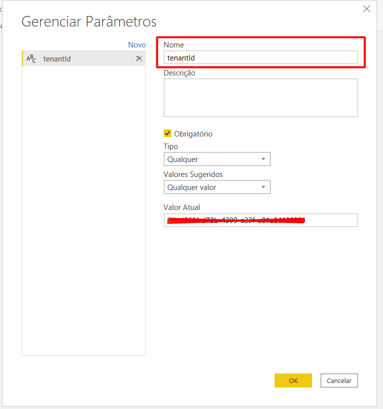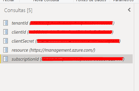 Agora crie um parâmetro para cada propriedade das credencias do azure, que obtivemos nas etapas anteriores.
